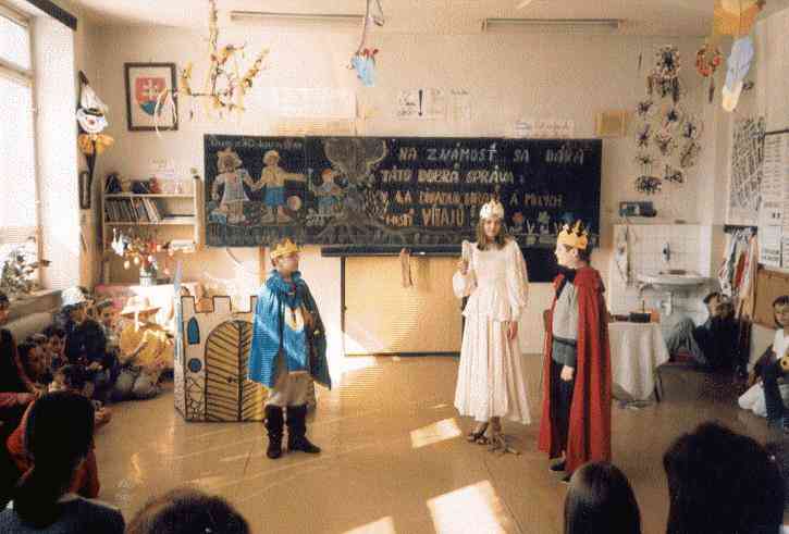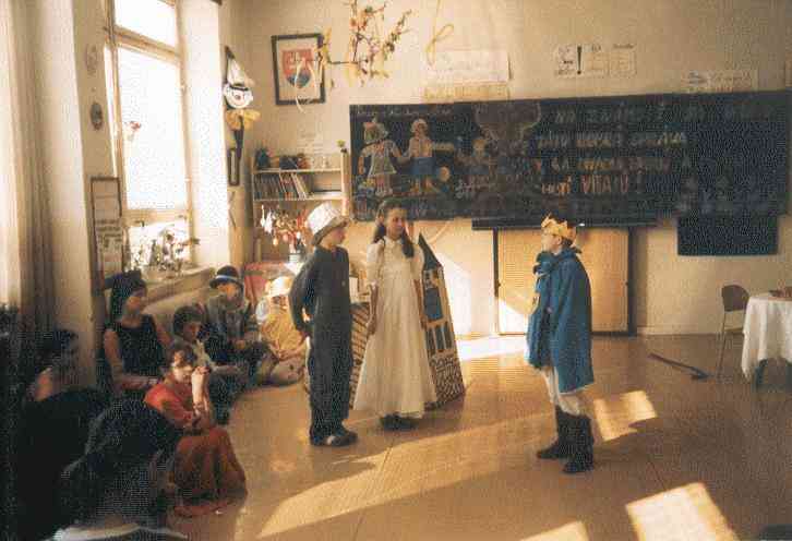 Takto sme hrali divadlo. Trieda 4.A nacvičovala s pani učiteľkou Pálešovou na motívy rozprávky P. Dobšinského divadelnú hru „ Slnečníkovi, Mesačníkovi, Veterníkovi a krásnej Uliane“. Reprezentovali školu na „Regionálnej prehliadke detských divadelných súboroch “ okresu Martin v Košťanoch n/Turcom dňa 19.marca 2003.